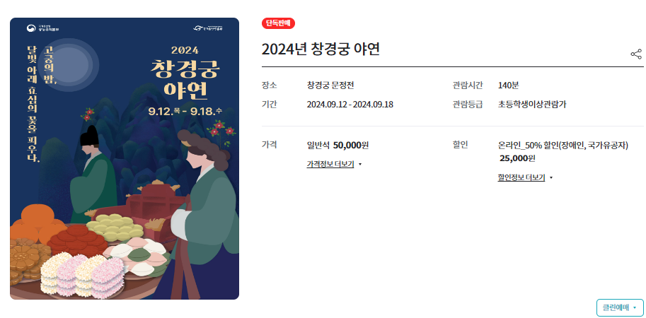 티켓링크 웹사이트를 방문하여 '창경궁 야연'을 검색하면 관련 정보를 확인할 수 있습니다.