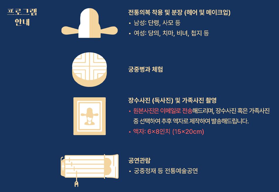 | 18:20 ~ 19:40 | 창경궁 야연 프로그램 체험 - 전통의복 착용 및 분장 (헤어 및 메이크업) - 궁중병과 체험 - 장수사진(독사진) 및 가족사진 촬영 |